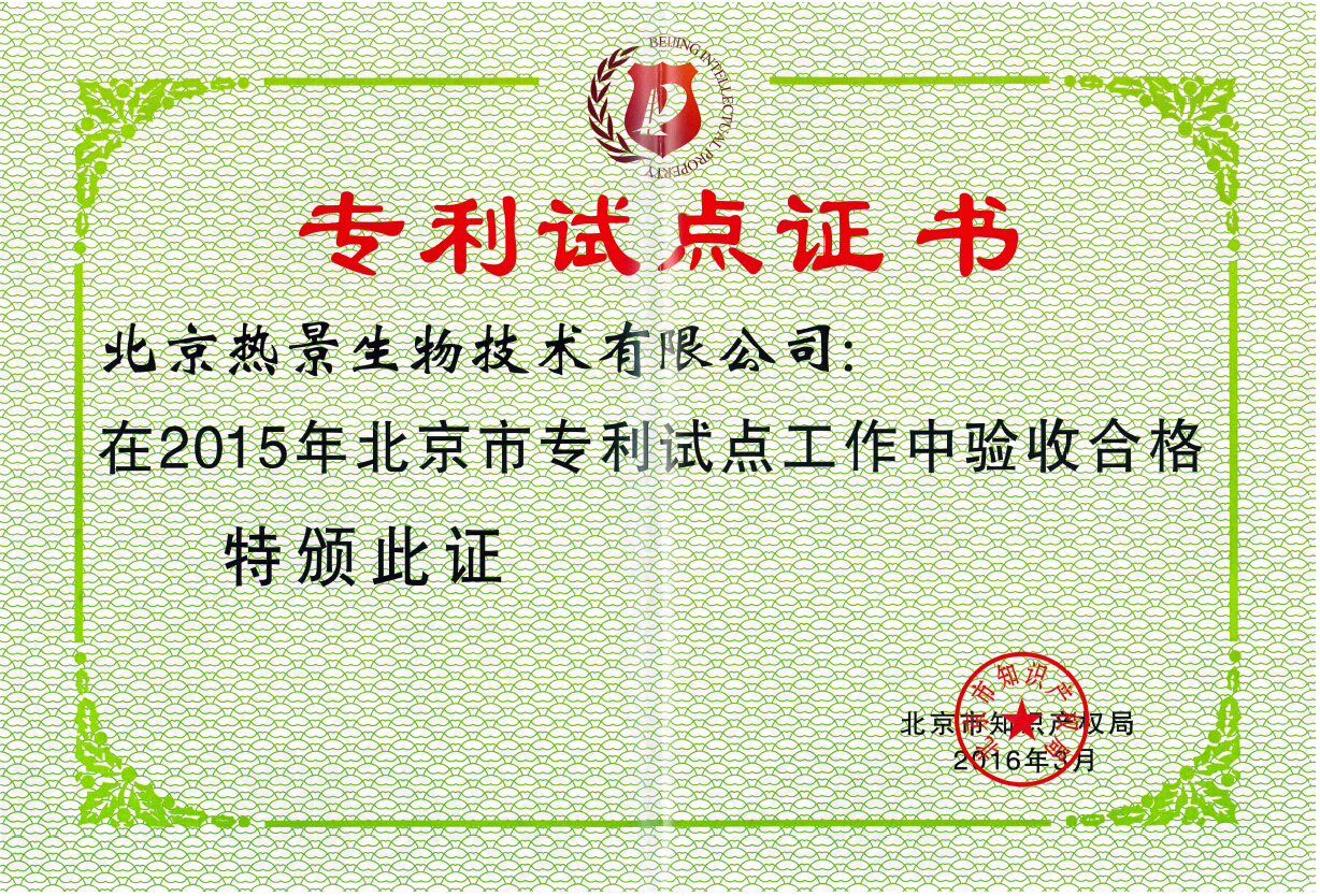 根據(jù)北京市專(zhuān)利試點(diǎn)工作的總體安排,北京市知識(shí)產(chǎn)權(quán)局對(duì)參加2015年北京市專(zhuān)利試點(diǎn)工作的企事業(yè)單位進(jìn)行了一年的試點(diǎn)培育工作,并與各區(qū)縣知識(shí)產(chǎn)權(quán)局、經(jīng)濟(jì)技術(shù)開(kāi)發(fā)區(qū)知識(shí)產(chǎn)權(quán)局共同對(duì)有關(guān)企事業(yè)單位進(jìn)行了專(zhuān)利試點(diǎn)考核驗(yàn)收工作,最終認(rèn)定北京熱景生物為2015年度北京市專(zhuān)利試點(diǎn)驗(yàn)收合格單位。