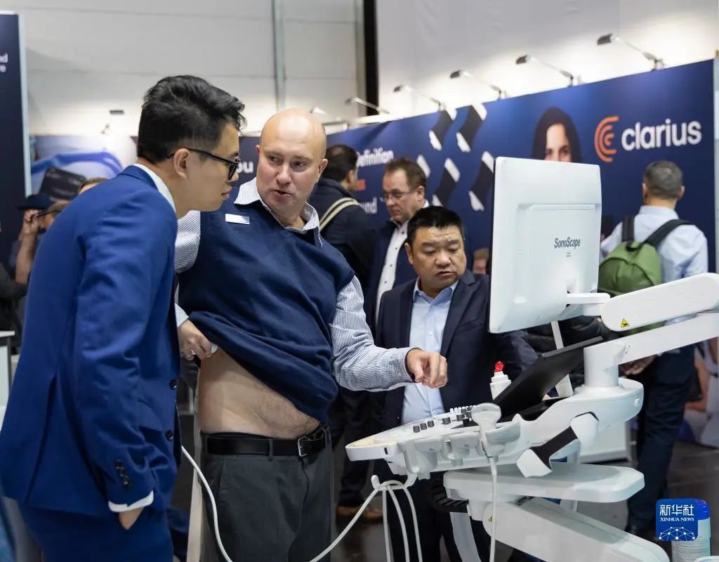 11月13日,在德國杜塞爾多夫國際醫(yī)療器械設(shè)備展,參觀者在開立醫(yī)療展位體驗超聲設(shè)備。新華社記者 張帆 攝