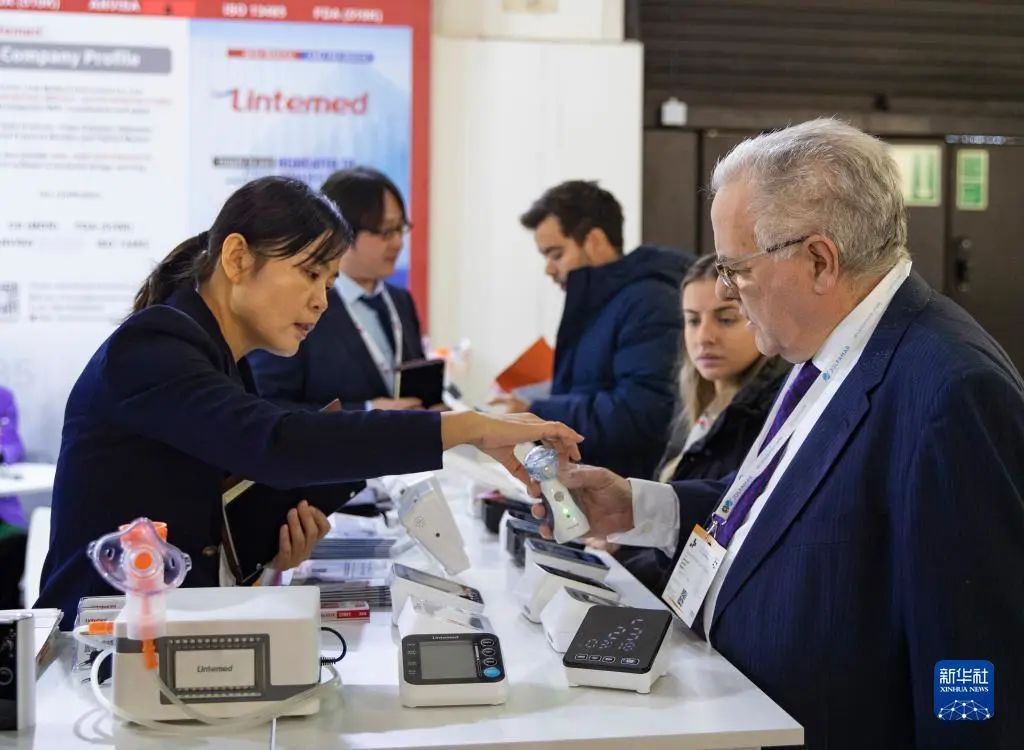 11月13日,在德國杜塞爾多夫國際醫(yī)療器械設(shè)備展,參觀者在科曼醫(yī)療展位咨詢洽談。新華社記者 張帆 攝