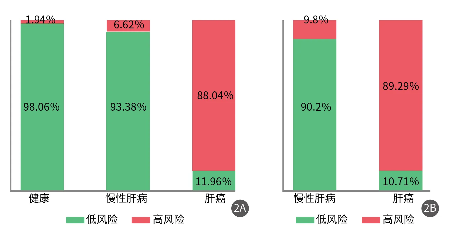 圖2  C-GALAD Ⅱ模型在測試集和驗(yàn)證集中不同人群的預(yù)測結(jié)果分布(2A為測試集,2B為驗(yàn)證集)