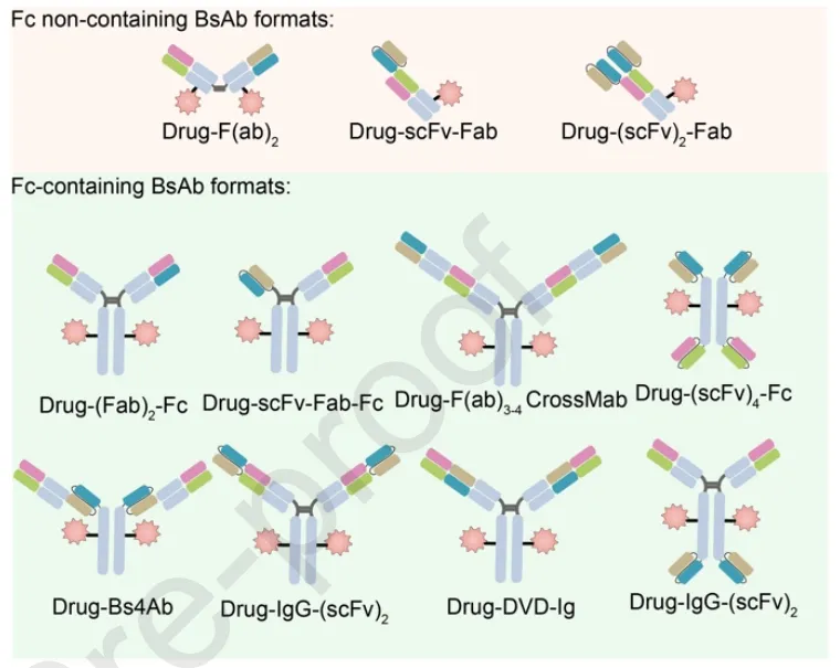 在探討B(tài)sADCs的分類時(shí),F(xiàn)c區(qū)的存在與否是一個(gè)關(guān)鍵的區(qū)分標(biāo)準(zhǔn)。不包含F(xiàn)c區(qū)的BsADCs在設(shè)計(jì)上可能會(huì)遇到穩(wěn)定性不足、容易聚集以及缺乏有效的偶聯(lián)位點(diǎn)等問(wèn)題。而含有Fc區(qū)的BsADCs則能夠帶來(lái)一系列額外的好處,如抗體依賴性細(xì)胞介導(dǎo)的細(xì)胞毒性(ADCC)、補(bǔ)體依賴性細(xì)胞毒性(CDC)、免疫吞噬作用以及細(xì)胞因子的釋放,這些都有助于增強(qiáng)對(duì)腫瘤的殺傷能力。以下是構(gòu)建含有Fc區(qū)的BsADCs的策略: