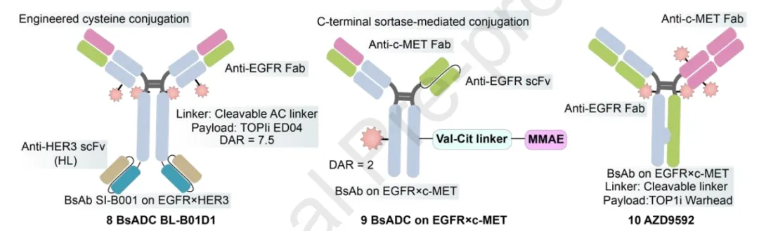目前,已有多種靶向c-MET和EGFR的雙特異性抗體(BsAb)被報(bào)道,它們?cè)谝种颇[瘤增殖和轉(zhuǎn)移方面顯示出協(xié)同效應(yīng)。在BsADC的設(shè)計(jì)中,精心選擇表位組合對(duì)于避免對(duì)c-MET的過(guò)度或部分激活至關(guān)重要。AZD9592是針對(duì)EGFR/c-Met的ADC,它通過(guò)可裂解的連接子偶聯(lián)了一種新型的拓?fù)洚悩?gòu)酶1抑制劑,主要目的是解決對(duì)奧希替尼(Osimertinib)的耐藥問(wèn)題。與EGFR相比,AZD9592對(duì)c-MET具有更高的親和力,旨在減少由EGFR介導(dǎo)的正常組織毒性。在患者來(lái)源的異種移植(PDX)模型和耐藥模型中,無(wú)論是單獨(dú)使用還是與奧希替尼聯(lián)合使用,AZD9592都顯示出了良好的抗腫瘤活性。