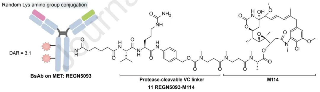與傳統(tǒng)的MET靶向抗體藥物偶聯(lián)物(ADC)相比,雙表位MET×MET-BsADC的設(shè)計(jì)提供了一種創(chuàng)新的解決方案來(lái)應(yīng)對(duì)現(xiàn)有挑戰(zhàn)。這種雙抗原抗體能夠形成2:2的抗原-抗體復(fù)合物,從而促進(jìn)MET的有效內(nèi)化和溶酶體轉(zhuǎn)運(yùn)。REGN5093-M114通過(guò)蛋白酶可裂解的連接子將Maytansinoid類有效載荷M114與靶向MET的雙特異性抗體(BsAb)的表面賴氨酸偶聯(lián),產(chǎn)生了平均藥物抗體比(DAR)為3.12的BsADC。