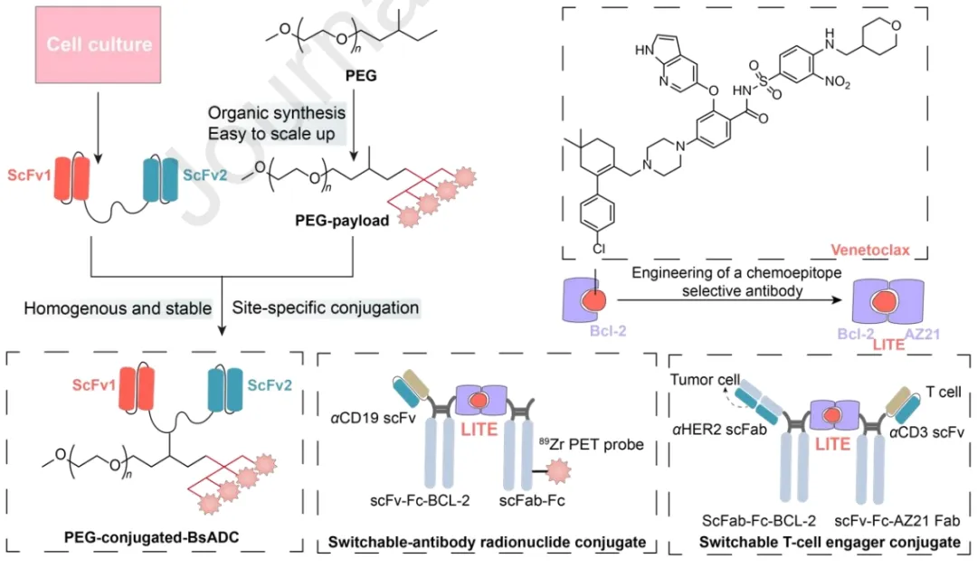 技術(shù)的創(chuàng)新為BsADCs的制備帶來(lái)了革命性的變化,并展現(xiàn)出顯著的優(yōu)勢(shì)。特別是PEG化的BsADC(P-BsADC)的發(fā)展,它不僅確保了偶聯(lián)的一致性,而且由于其較小的分子尺寸和缺乏Fc片段,展現(xiàn)出更高的內(nèi)吞效率、組織滲透能力以及較低的毒性。