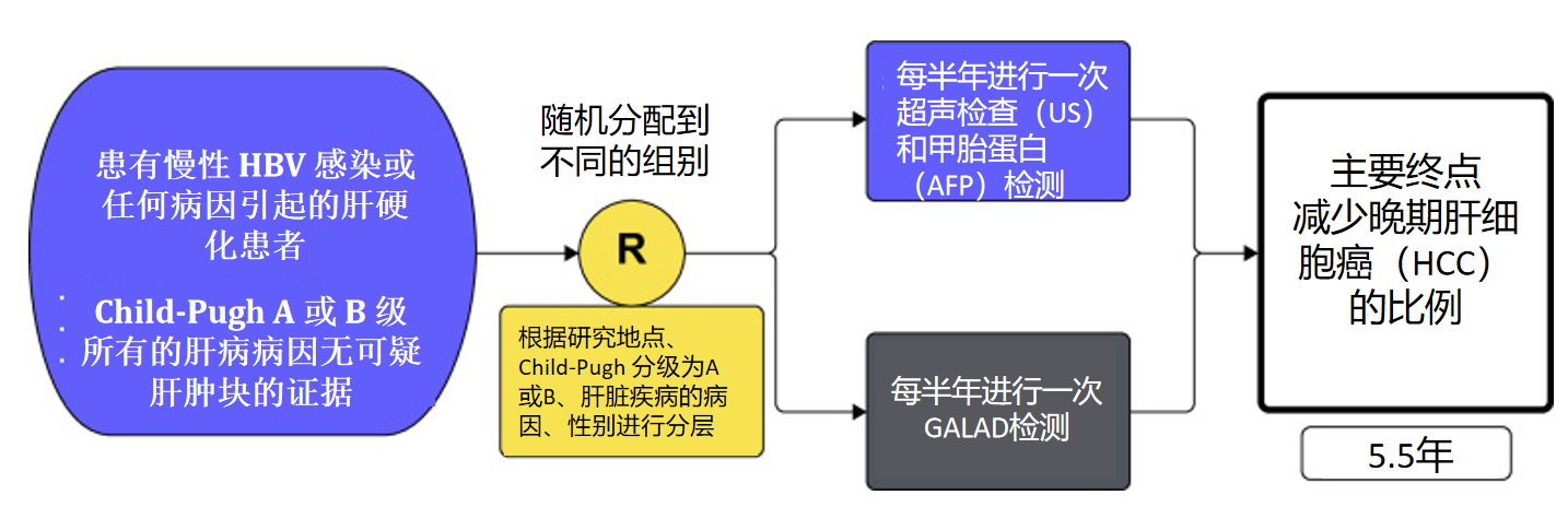 為了驗證GALAD模型在真實世界中的臨床應用效果,美國國家癌癥研究所(NCI)牽頭開展了TRACER試驗。TRACER 研究是一項實用的隨機 IV 期試驗,旨在比較基于超聲的篩查與生物標志物組合 GALAD 在患有慢性 HBV 感染或任何病因引起的肝硬化患者中的應用。簡而言之,5500 名患者以 1:1 的方式隨機分配到 A 組,建議每半年進行一次超聲 ± AFP 篩查,或 B 組,建議每半年進行一次 GALAD 篩查。按地點、Child-Pugh 分級(A 與 B)、肝病病因(病毒性、非病毒性和非肝硬化性 HBV 感染)和性別進行隨機分層。通過對比兩組的結果,研究人員希望能夠確定哪種方法能更好地減少晚期肝癌的發(fā)現(xiàn)率,并改善患者的治療效果。