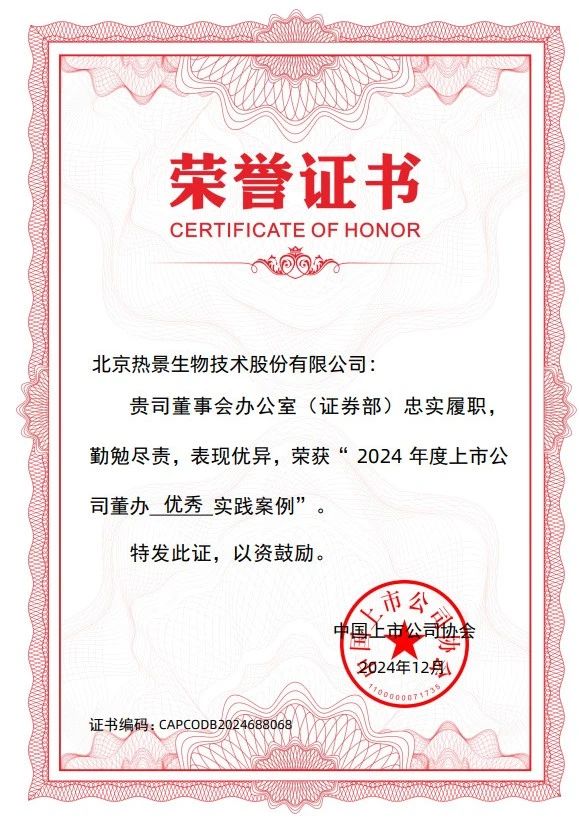 熱景生物連續(xù)三年獲評(píng)中國(guó)上市公司協(xié)會(huì)“上市公司董辦優(yōu)秀實(shí)踐案例”