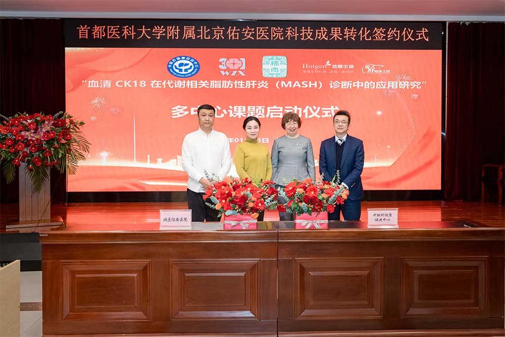 馬迎民院長代表我院與大興區(qū)上市企業(yè)熱景生物就肝病中心三科張晶主任主導(dǎo)研發(fā)的“代謝相關(guān)脂肪性肝?。∕AFLD)關(guān)鍵基因多態(tài)性聯(lián)合檢測試劑盒”簽訂轉(zhuǎn)化協(xié)議。