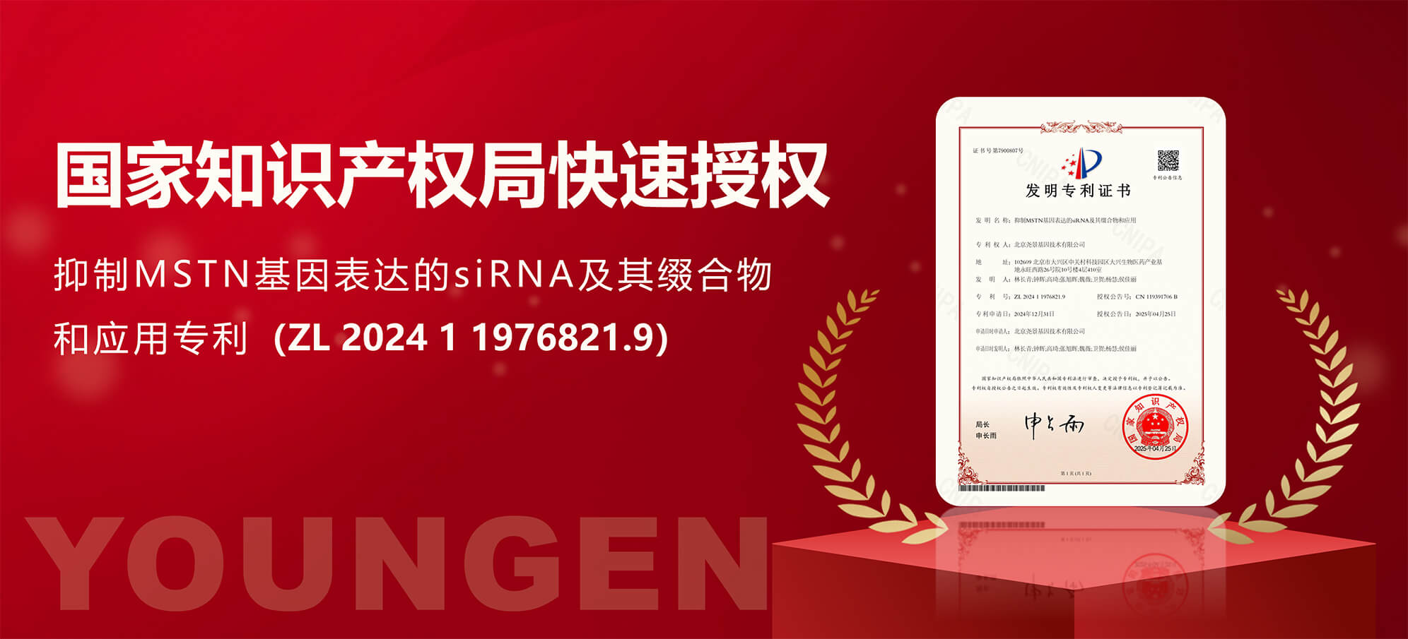 近日,熱景生物參股公司北京堯景基因技術(shù)有限公司,被國家知識(shí)產(chǎn)權(quán)局快速授權(quán)了名為“抑制MSTN基因表達(dá)的siRNA及其綴合物和應(yīng)用”專利(ZL 2024 1 1976821.9)。該專利提供一種能夠抑制MSTN基因表達(dá)的siRNA分子,以期對(duì)包括MSTN基因相關(guān)的肥胖等疾病提供新的治療方式。該項(xiàng)專利的快速授權(quán)基于堯景基因行業(yè)領(lǐng)先的序列設(shè)計(jì)修飾、靶點(diǎn)評(píng)估FISTTM和肝外遞送STTTM技術(shù)平臺(tái)。