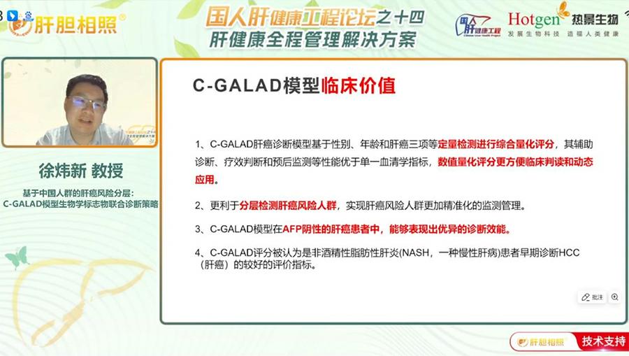 上海交通大學(xué)醫(yī)學(xué)院附屬仁濟醫(yī)院嘉定分院檢驗科的徐煒新教授圍繞肝癌早篩技術(shù)革新發(fā)表主題報告,他深入解析C-GALAD模型的臨床價值與應(yīng)用前景,為肝癌防控提供新策略?,F(xiàn)狀與突破----我國肝癌早期診斷率低,傳統(tǒng)超聲聯(lián)合AFP檢測對早期小肝癌敏感性不足?;凇逗D鲜≡缙诟伟┖Y查實施方案》將“肝癌三項”(AFP、AFP-L3%、異常凝血酶原)納入常規(guī)篩查,徐主任指出,多標志物聯(lián)合檢測成為破局關(guān)鍵:AFP-L3%提升惡性鑒別特異性,異常凝血酶原(DCP)反映腫瘤侵襲性,三者互補顯著提高早診效能。 C-GALAD模型:本土化創(chuàng)新典范----針對中國80%以上肝癌由乙肝驅(qū)動的人群特征,熱景生物研發(fā)的C-GALAD模型,整合年齡、性別與“肝癌三項”定量數(shù)據(jù),通過算法生成風(fēng)險評分,實現(xiàn)三大優(yōu)勢:①精準分層:量化評分指導(dǎo)高危人群分級管理(如肝硬化患者每6個月聯(lián)合超聲篩查);②動態(tài)監(jiān)測:評分變化早于影像學(xué)提示復(fù)發(fā)風(fēng)險,助力療效評估;③指南推薦:獲《原發(fā)性肝癌診療指南(2024年版)》認可,成為輔助診斷核心工具。臨床與政策協(xié)同---國內(nèi)外指南均強調(diào)風(fēng)險分層管理。徐主任呼吁推動“C-GALAD+超聲”聯(lián)合篩查普及,并展望未來融合液體活檢、AI影像技術(shù),構(gòu)建普惠化早篩體系。