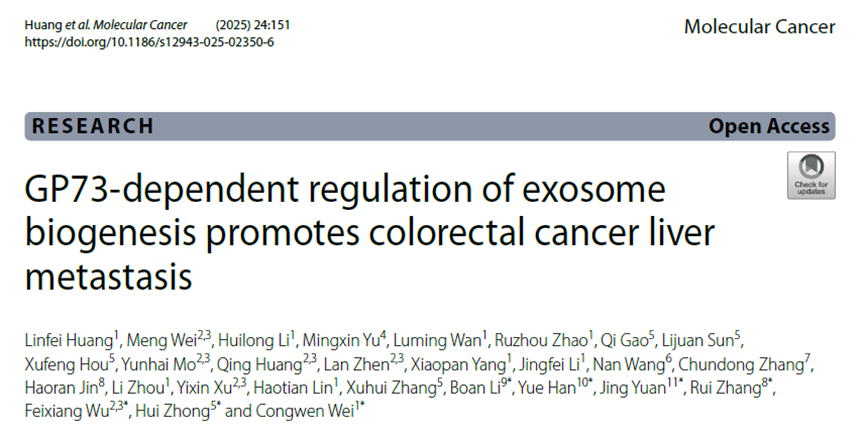 近日,北京堯景基因技術(shù)有限公司鐘輝研究員聯(lián)合廣西醫(yī)科大學(xué)附屬腫瘤醫(yī)院吳飛翔主任醫(yī)師、軍事醫(yī)學(xué)研究院魏從文研究員、遼寧省腫瘤醫(yī)院張睿主任醫(yī)師、首都兒科研究所袁靜教授等團(tuán)隊在Molecular Cancer(影響因子27.7)雜志上發(fā)表題為“GP73-dependent regulation of exosome biogenesis promotes colorectal cancer liver metastasis”的重磅文章。